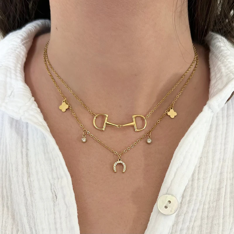 Sa chaîne fine est ornée de charms délicats : un fer à cheval serti de zirconiumsn des pampilles scintillantes et deux trèfles stylisés.