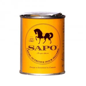 La crème nutritive SAPO nourrit en profondeur, assouplit et régénère les cuirs de sellerie : selles, sangles, bridons, brides, harnais, rênes, gants, bottes,…. La Graisse à cuir Sapo enlève le « glissant » du cuir du siège et des quartiers de la selle, ce qui renforce donc la stabilité du cavalier. SAPO est une excellente graisse à cuir qui évite de façon efficace la formation de moisissure tout en protégeant les coutures. Elle protège durablement des taches et rend le cuir plus résistant à la déchirure.